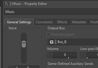If you want a sound to go to both outputs, you can add an auxilliary bus to the other one. However, make sure this sound is listened to by listeners that are assigned to each output device (we’ll cover this later on).
